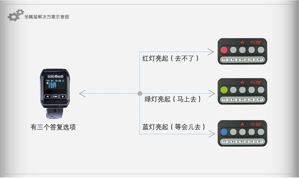 2、當(dāng)被叫人員收到信息后,通過手表機(jī)上的選項(xiàng)進(jìn)行確認(rèn),如:馬上去、去不了和過一會兒去等,確認(rèn)信息經(jīng)由主機(jī)反饋給柜員呼叫器;