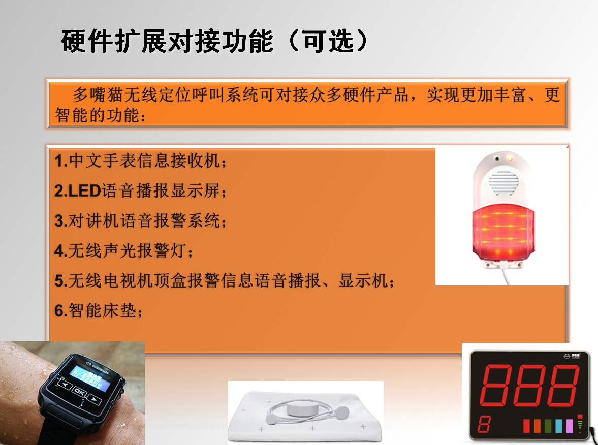 系統(tǒng)擴展性強(定制軟件功能、手表接收報警信息、監(jiān)控攝像和警燈聯(lián)動及家屬APP報表等)