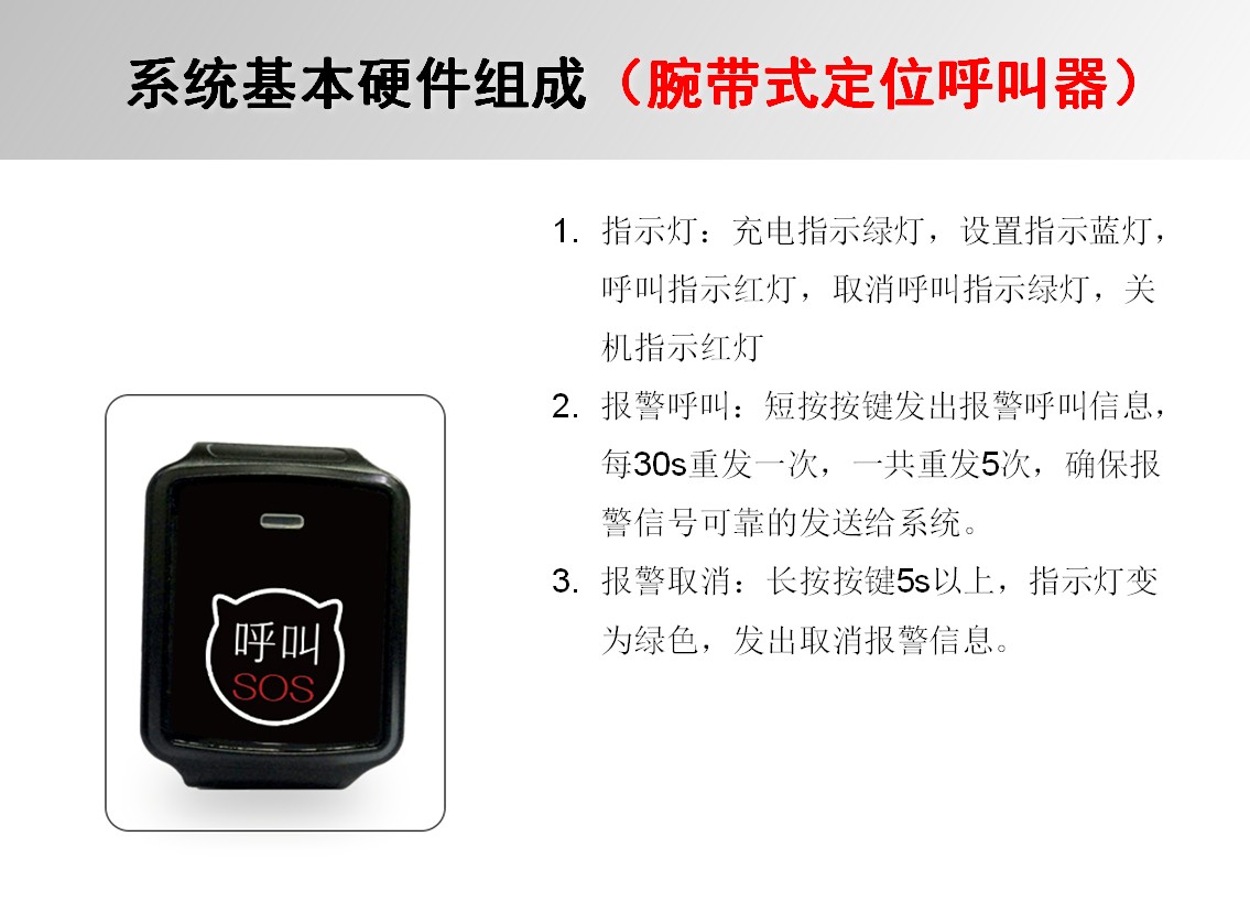 腕帶式無線定位報警求助按鈕,按鍵可同時發(fā)送呼叫者身份信息和報警位置信息,一充電一般可用15-30天。