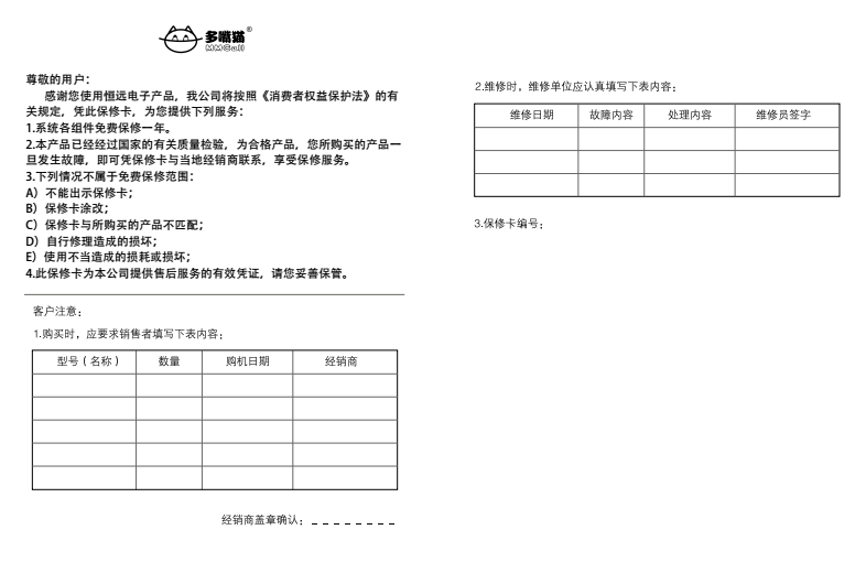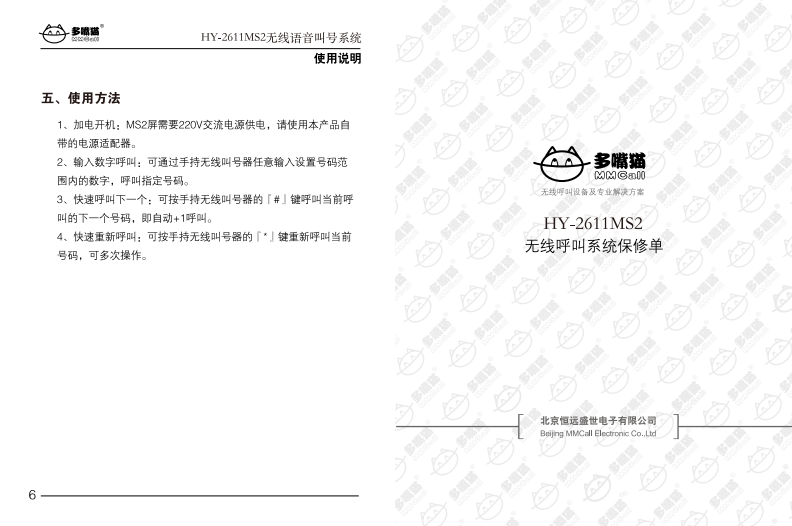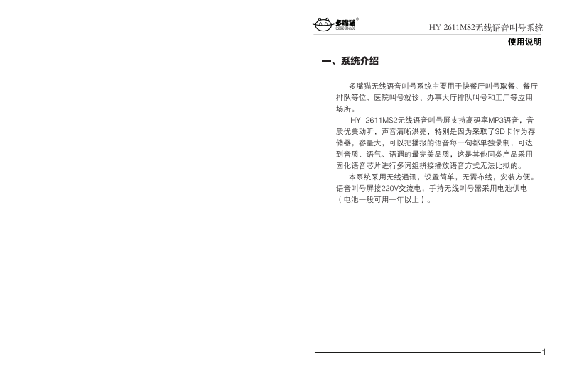 多嘴貓”HY2611T型餐飲無線呼叫服務(wù)系統(tǒng)說明書