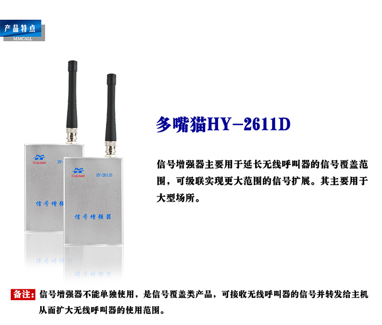 特點(diǎn):信號增強(qiáng)器主要用于延長無線呼叫器的信號覆蓋范圍,可級聯(lián)實(shí)現(xiàn)更大范圍的信號擴(kuò)展。其主要應(yīng)用于大型場所。
